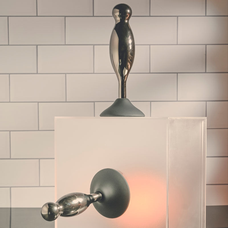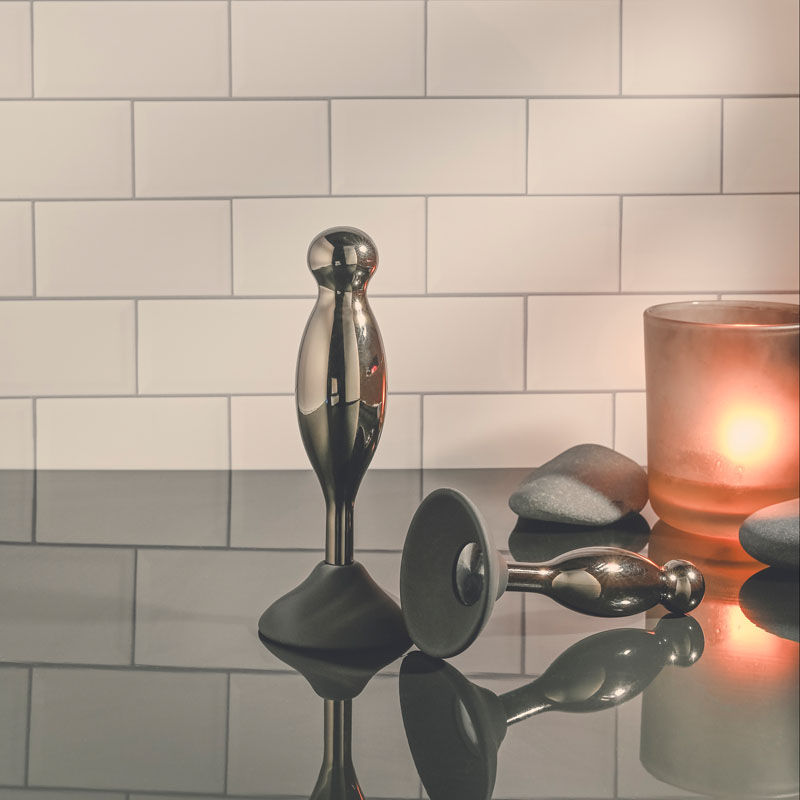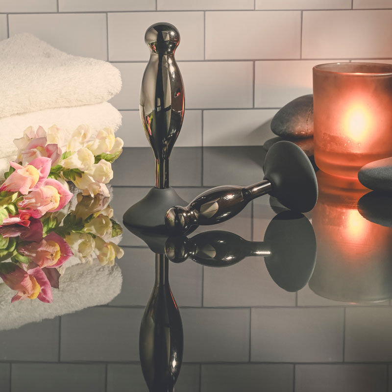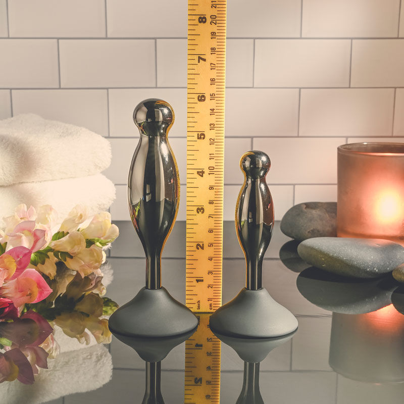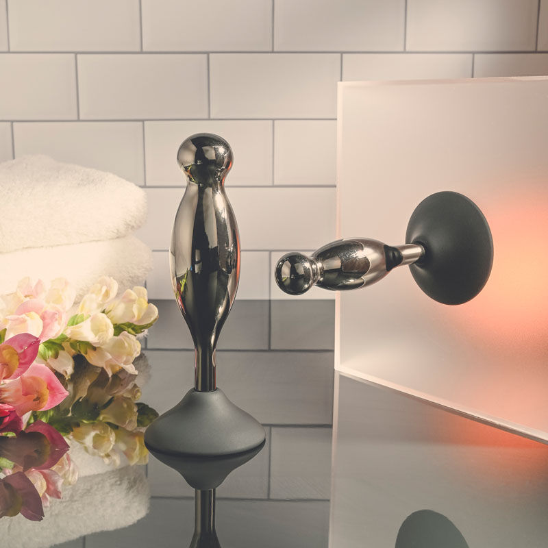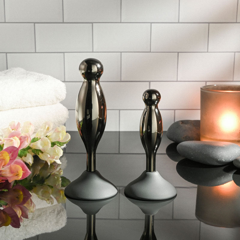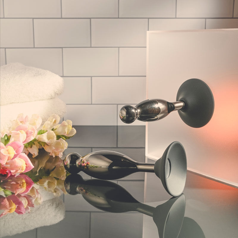 Explore delicious hands-free back-door play with this two-piece plug set that gives new meaning to the term ‘joystick!’ Each silicone base powerfully suctions onto any clean surface while the black chrome-finished alloy shape bobs and swirls in place wherever you crave it most! With a swelling shaft that ends in a round bulb at the tip, each plug gives you a different experience in length and girth. Enjoy these waterproof toys during bath time and clean easily with Evolved Toy Cleaner and a hot water rinse.