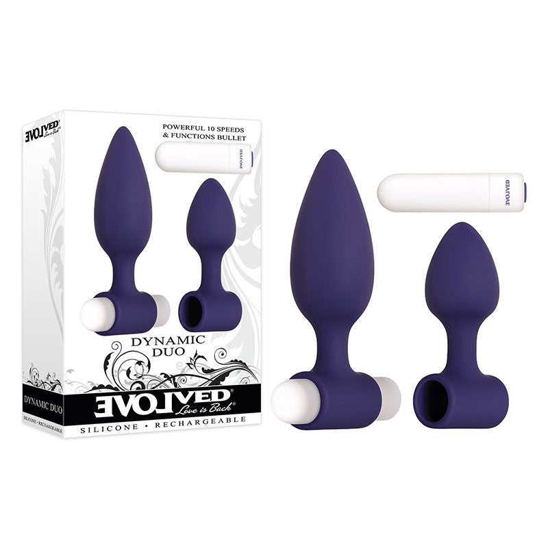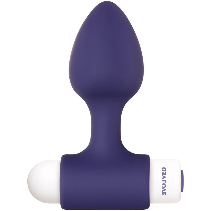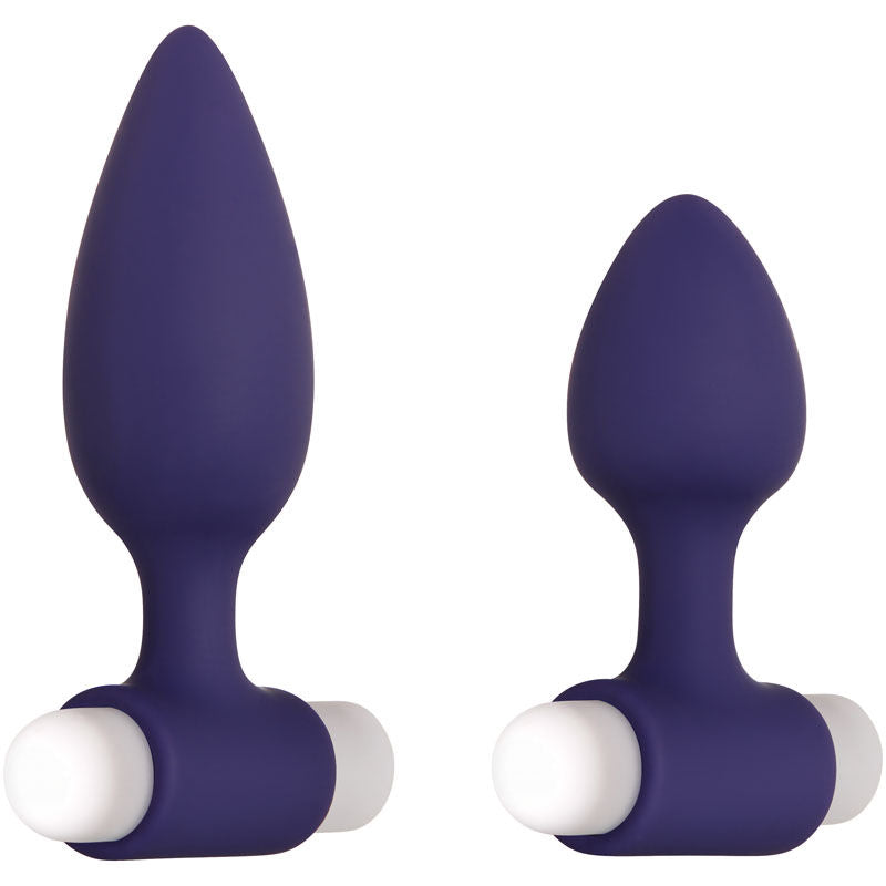 Two silky-smooth silicone vibrating butt plugs in one versatile package! Explore your anal erogenous zone with thrilling results by trying two different sizes, both with tapered tips and one powerful interchangeable bullet, even under water as they are completely water submersible. The easy to use 1-button control lets you discover 10 speeds and functions as the plug moves with your body on its flexible stem. Clean-up is easy with Evolved toy cleaner and a hot water rinse.