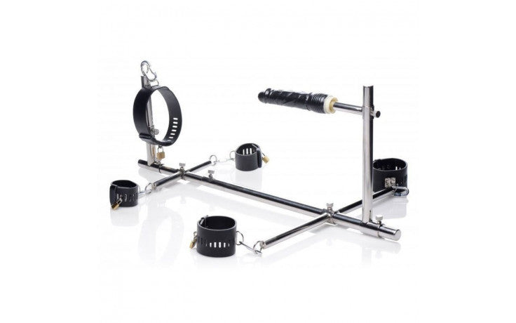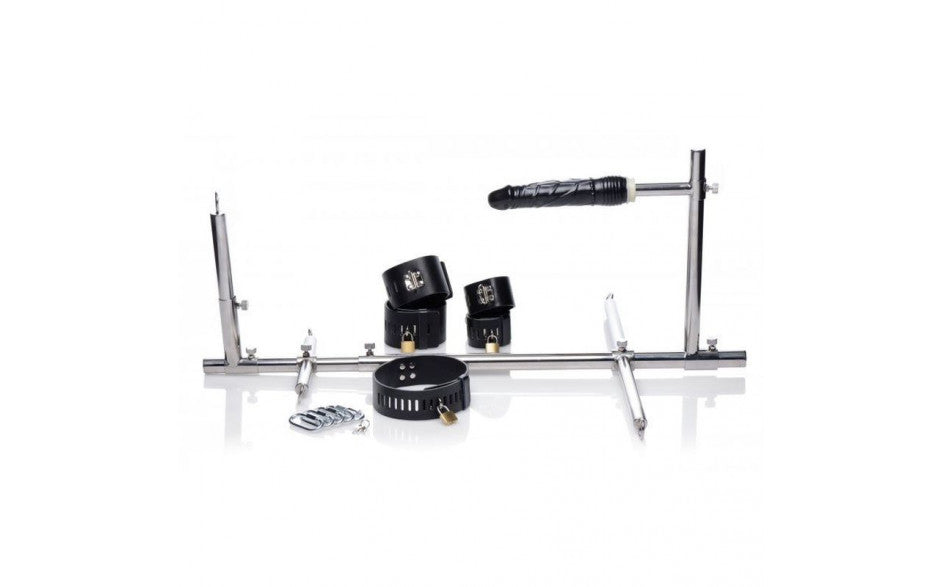 Strap your submissive fuck toy into this metal stockade and fill them up with the big, veiny, black dildo! As you play thing been bad? Punish and pleasure them at the same time when they're restrained by the wrists, ankles, and neck. The simple and sturdy construction via screw-tight rods allows you to customize the entire frame of the stockade. Position the dildo at the perfect height and distance from their hole. Move their wrists and ankles forward or back and extend the entire length of the stockade. Keep their head low to the ground or force them to keep their chin up high! You are in complete control so put your play thing in a position that suits you! The beautifully crafted and heavy duty cuffs are adjustable as well, to fit any sized slave. The locking closures keep them trapped until you're done playing with them. D-rings on each piece allow you to connect them to the stockade or use the cuffs and collar independently to fulfill all your fantasies. Lock down your lover in a piece of bondage furniture that allows you to explore new depths of depravity!